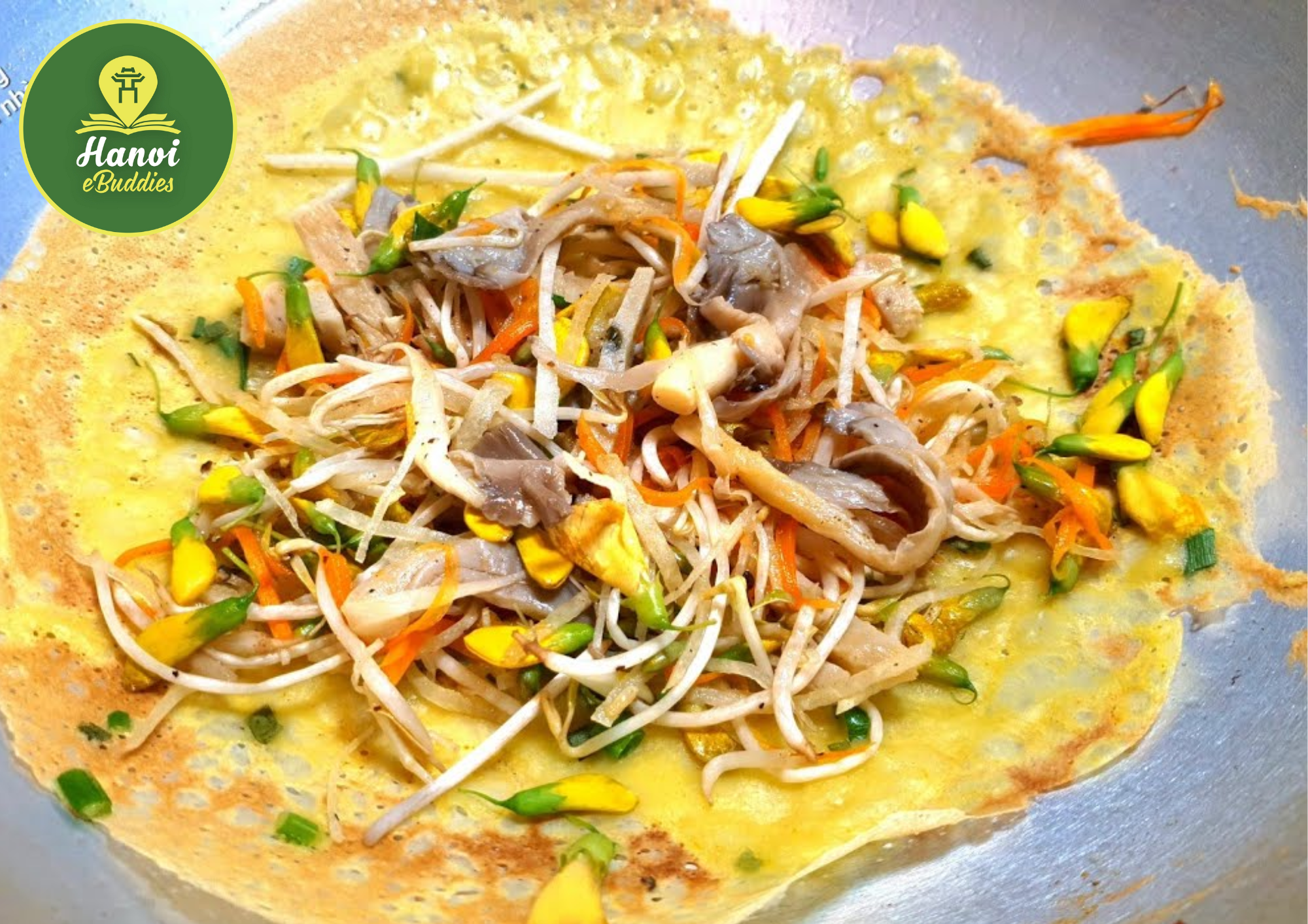 To cook, heat a large pan with a little oil, pour in a ladle of batter, and tilt the pan to spread it into a thin layer. After that, cover the batter until we use to cook, then add the filling in the center, cover again, and cook until the batter is crispy. In Central Vietnam, people often use smaller, flat-bottomed pans.